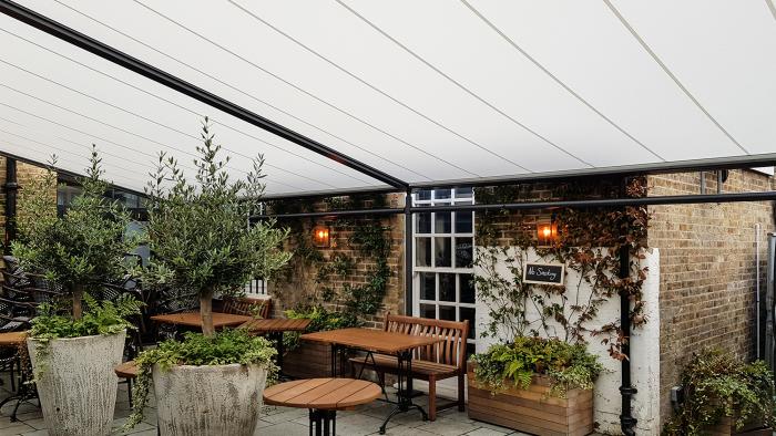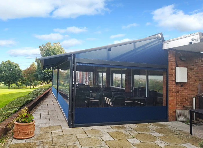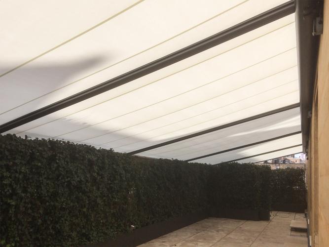 Our Bellfort® Terrace Awning is a fully retractable fabric roof on fixed rails and, when installed with integrated side-screens, encloses a terrace to provide a warm, protected, unconfined space filled with natural light and minimal framework. The exceptional strength of the awning utilizes zipped channels and storm-proof fabric. The Bellfort® Terrace Awning is the ideal choice for outdoor commercial or residential areas especially suited to exposed locations as all components are 100% corrosion resistant.