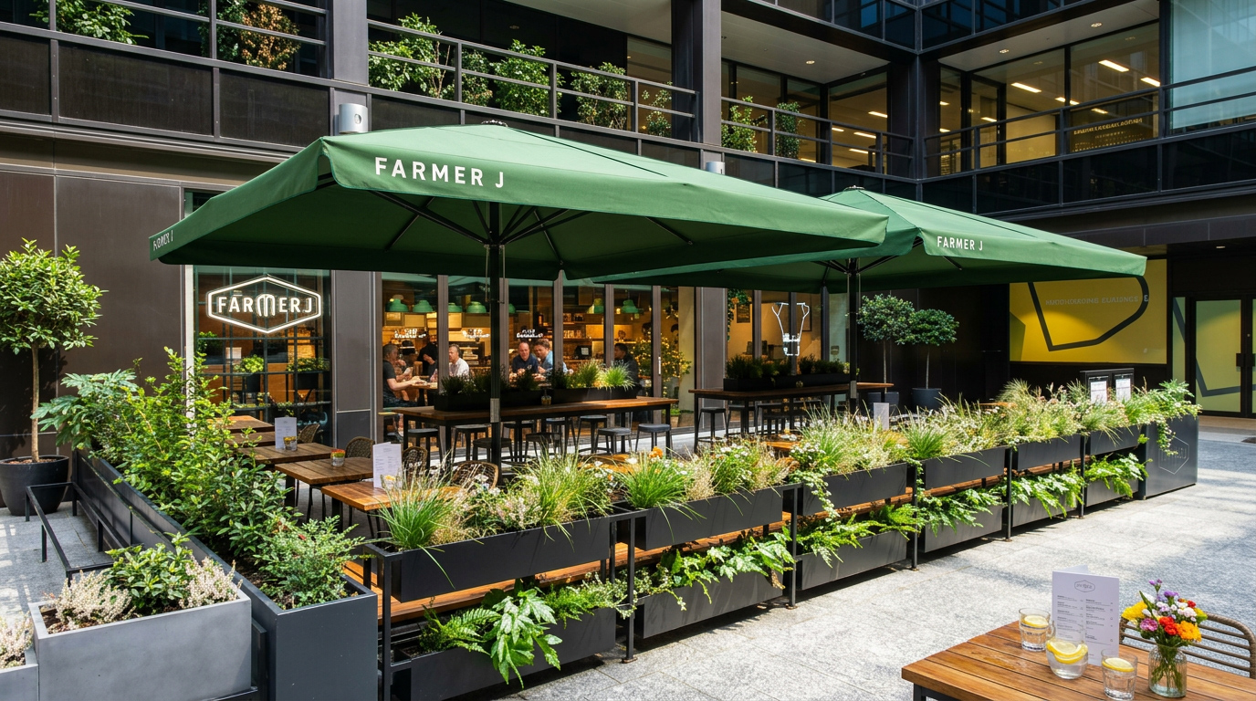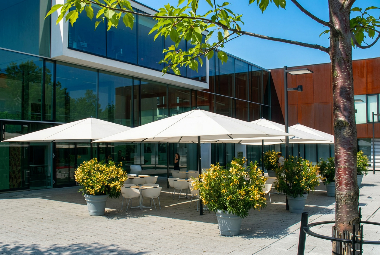 Can protect large areas, excellent sun and rain protection, meets smoking regulations, suitable for side-curtains & good branding potential.