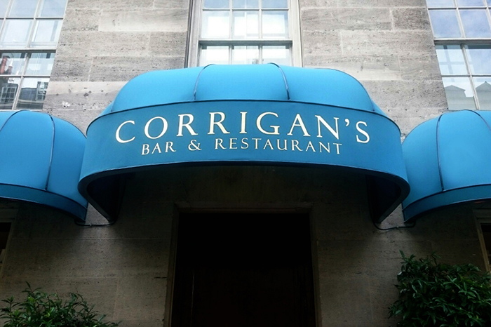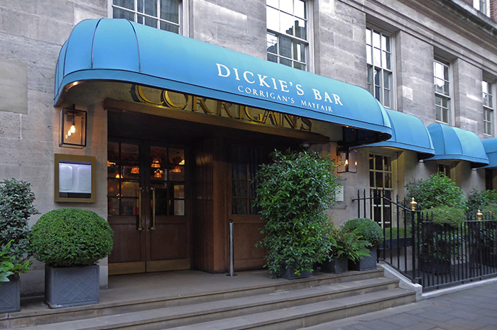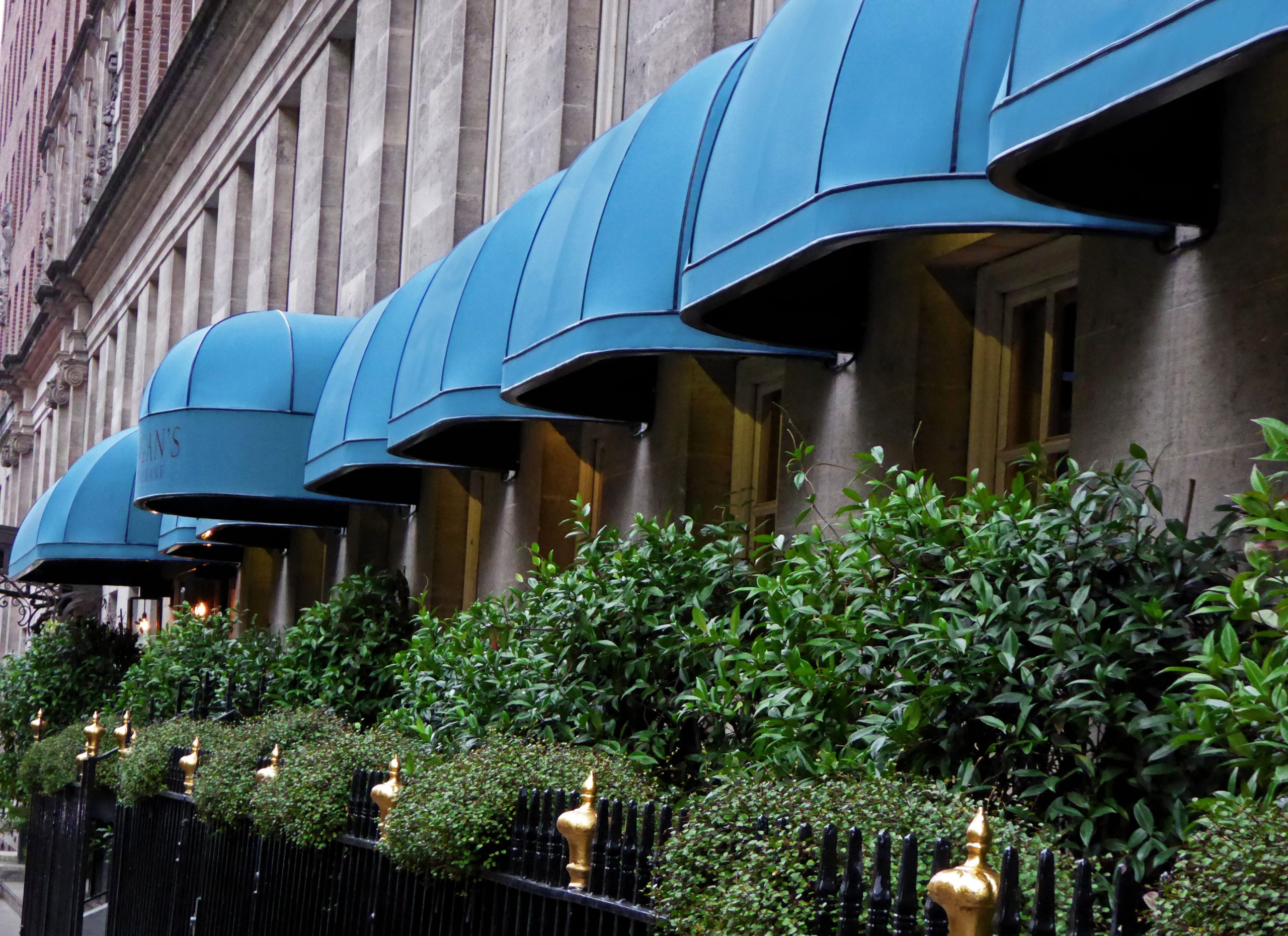 Classic restaurant awning styling using our Rib® Canopy System on Grade II listed building with extended canopy for the entrance.